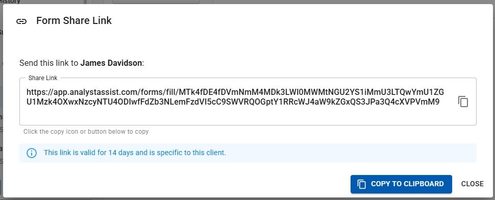 When you have selected the Client/Patient Record from the list, click the ‘Select Client’ button and the ‘Form Share Link’ panel will appear. Click the ‘Copy to Clipboard’ button or icon to copy the link to your computer’s clipboard. You can then ‘Close’ the panel (or click the ‘Escape’ key) to close the panel.